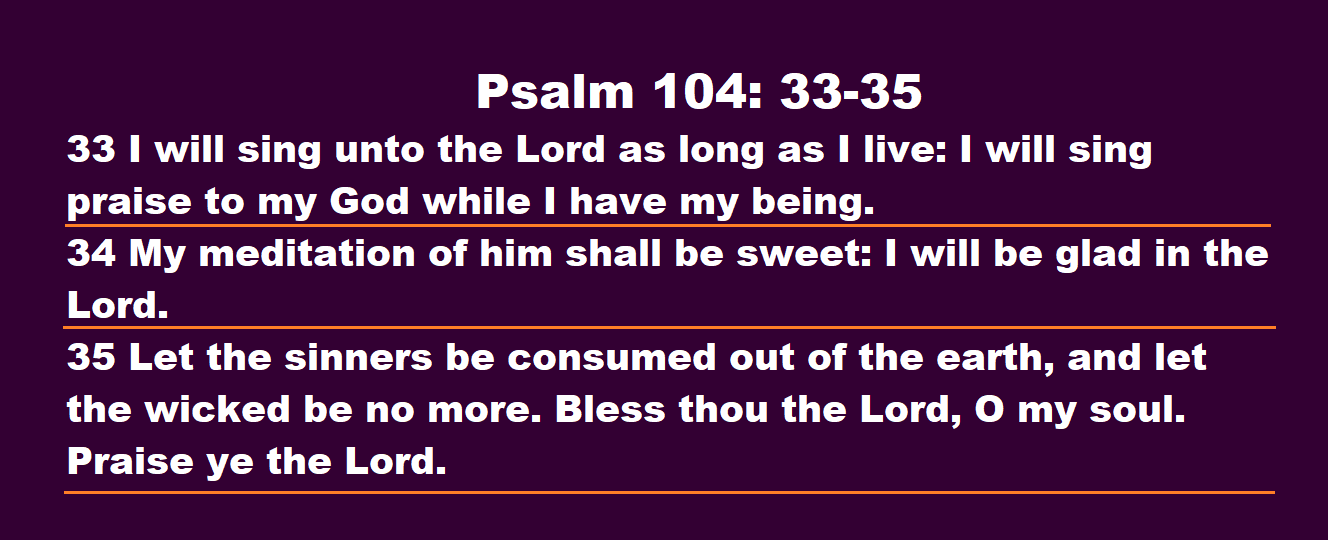 I will sing to the Lord for as long as I live. In these verses, the psalmist commits to praising and singing to God throughout their life. They find joy and comfort in thinking about God, recognizing His constant care over creation. Worship is not a one-time event—it becomes a lifelong response to God’s goodness. May evil fade away so that only God’s goodness remains. The psalmist then expresses a desire for sin and wickedness to be removed from the world. They long for a world that reflects God's character—a world filled with righteousness, joy, and peace. Praise the Lord! The passage ends with a strong declaration of worship, showing that when we see who God is and what He does, our natural response should be praise. Read more
